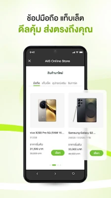 สัมผัสความพิเศษที่เหนือกว่าด้วย AIS Points ที่มอบสิทธิประโยชน์และรางวัลมากมายให้คุณได้เลือกสรร ไม่ว่าจะเป็นแพ็กเกจโทรและเน็ตที่คุ้มค่า ส่วนลดพิเศษจากร้านอาหารและเครื่องดื่ม หรือโอกาสในการร่วมลุ้นของรางวัลใหญ่ myAIS เปิดโลกแห่งความสุขที่ปรับให้เข้ากับทุกไลฟ์สไตล์ และยิ่งไปกว่านั้น คุณยังสามารถสะสมและเชื่อมโยงคะแนนกับพาร์ทเนอร์ เพื่อยกระดับประสบการณ์การแลกความสุขให้กว้างขวางยิ่งขึ้น ค้นพบดีลและแพ็กเกจที่คัดสรรมาเพื่อคุณโดยเฉพาะ ทั้งแพ็กเกจโทรศัพท์, อินเทอร์เน็ต, โรมมิ่ง และความบันเทิง ไปจนถึงการเลือกซื้อสมาร์ทโฟน แท็บเล็ต และอุปกรณ์เสริมสุดคุ้มค่า รวมถึงบริการเสริมออนไลน์หลากหลายรูปแบบ เช่น ประกันภัยและการเงิน ทั้งหมดนี้ทำได้อย่างง่ายดายผ่าน myAIS พร้อมดีไซน์ใหม่ที่ใช้งานง่ายและลื่นไหลกว่าที่เคย